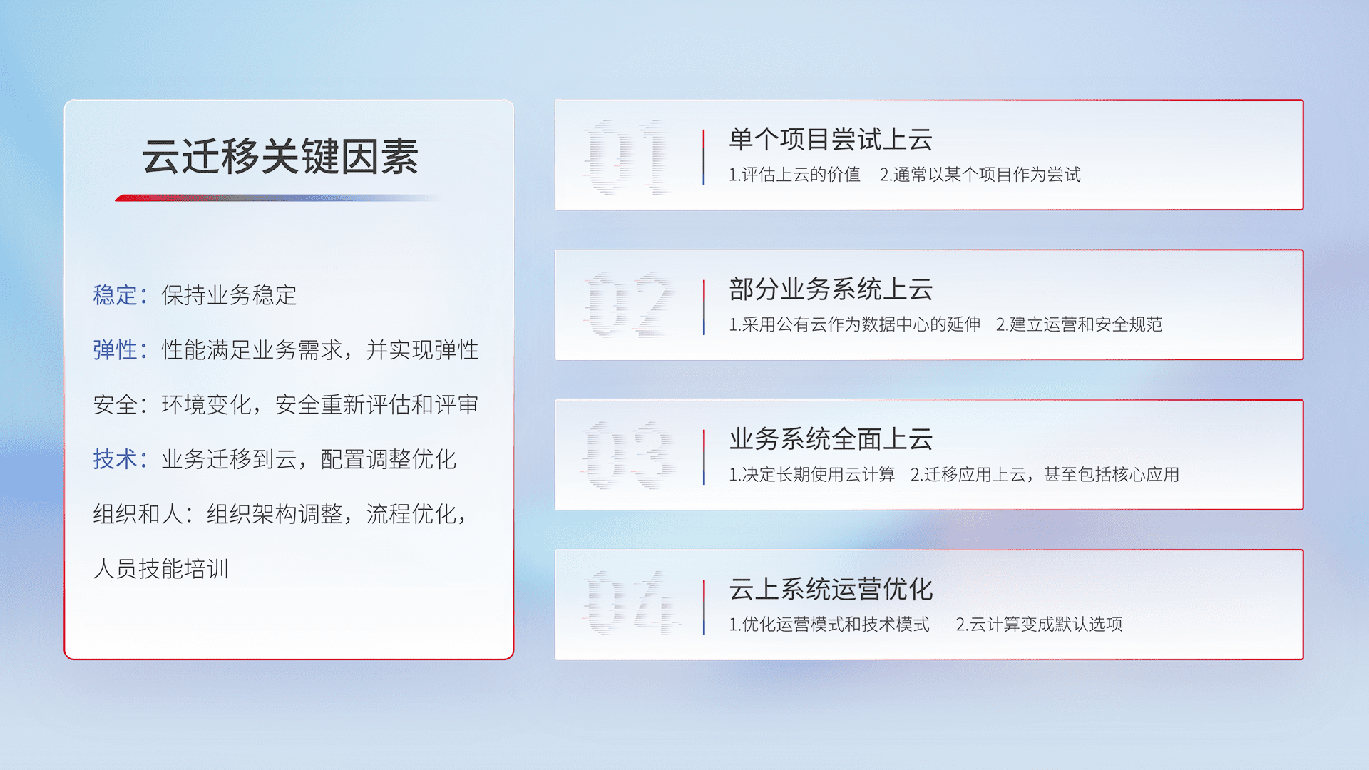 结合实际业务,,,,从规划设计、、、云平台选型、、云原生改造、、数据迁移、、、、集成交付,,,迁移全过程为客户识别最佳上云路径,,,,做好风险识别管理,,设计网络架构、、、、身份权限、、、、安全审计合规、、操作审计、、、、日志审计、、、监控告警策略、、多站点容灾设计等,,对云上基础设施进行整体规划,,,,提升IT治理水平,,以满足弹性、、高可用、、、、高性能的需求。。