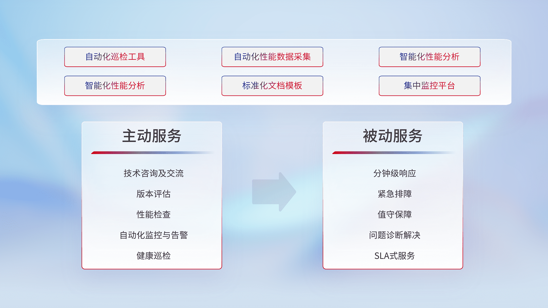 智能化工具和标准化文档,,,保障服务质量,,提供主动服务(包含技术咨询、、、版本评估、、、、性能检查、、自动化监控与告警、、健康巡检)和被动服务包含(分钟级响应、、、、紧急排障、、、值守保障、、问题诊断解决、、SLA服务)。。。